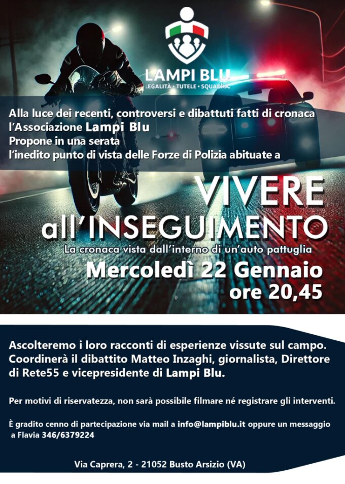L’iniziativa vedrà la partecipazione di Giulia Mammola, Dirigente della Squadra Mobile della Questura di Varese, Elisabetta Brusa, avvocato penalista, e Lorenzo Guzzetti, autore del romanzo “Si fa in due”. La serata sarà moderata da Matteo Inzaghi, giornalista, Direttore di rete55 e vicepresidente di Lampi Blu.