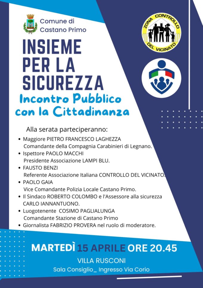 Castano Primo nella Sala Consiglio di Villa Rusconi (ingresso in via Corio) si terrà un incontro pubblico sul tema “Insieme per la sicurezza”. Alla serata parteciperanno: il maggiore Pietro Laghezza, comandante della Compagnia Carabinieri di Legnano; il luogotenente Cosimo Paglialunga, comandante della Stazione di Castano dell’Arma; l’ispettore Paolo Macchi, presidente dell’associazione Lampi Blu; Fausto Benzi, referente dell’Associazione italiana controllo del vicinato; Paolo Gaia, vice comandante della Polizia Locale di Castano Primo e Nosate; il sindaco Roberto Colombo e l’assessore alla sicurezza del Comune Carlo Iannantuono.